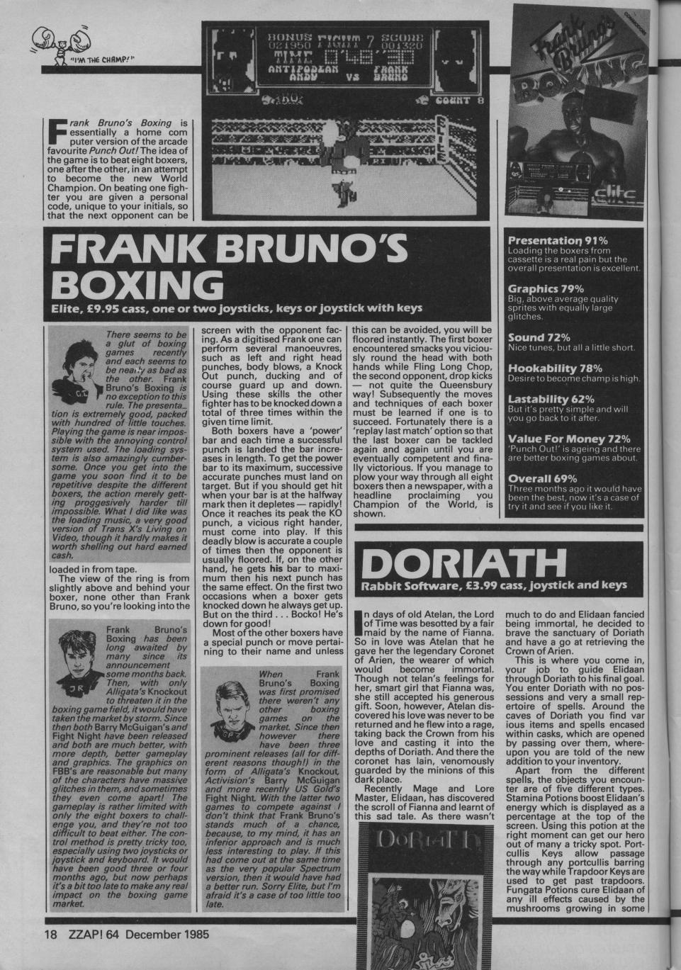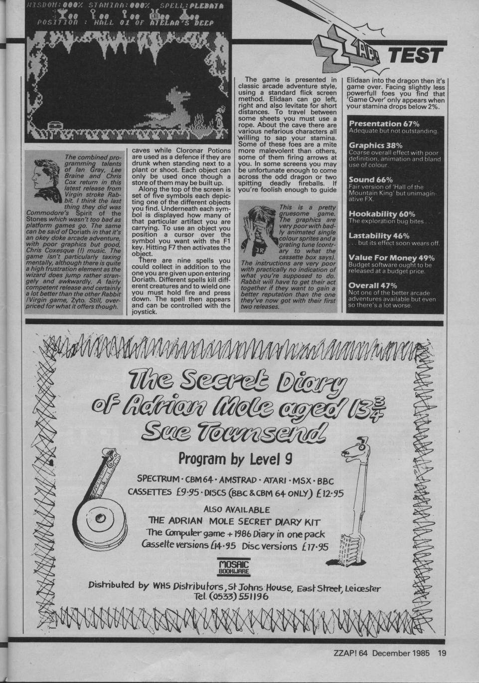 | An article from the December, 1985 issue of ZZAP! 64 magazine. They review the game (and aren't very kind about it...) Nevertheless, it's amazing that this still exists and was found by two very dedicated fans. -submitted by Flavio & Eugenio. |